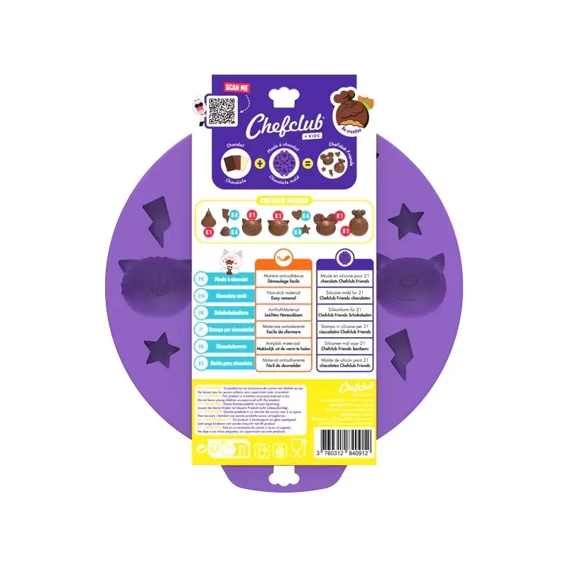 De Chefclub Friends bonbonvorm heeft 21 vormpjes met dieren zoals een kat, muis, varken en kip. De bonbonvorm is gemaakt van siliconen. Gebruik de chocoladevorm om bonbons te maken met je kinderen.