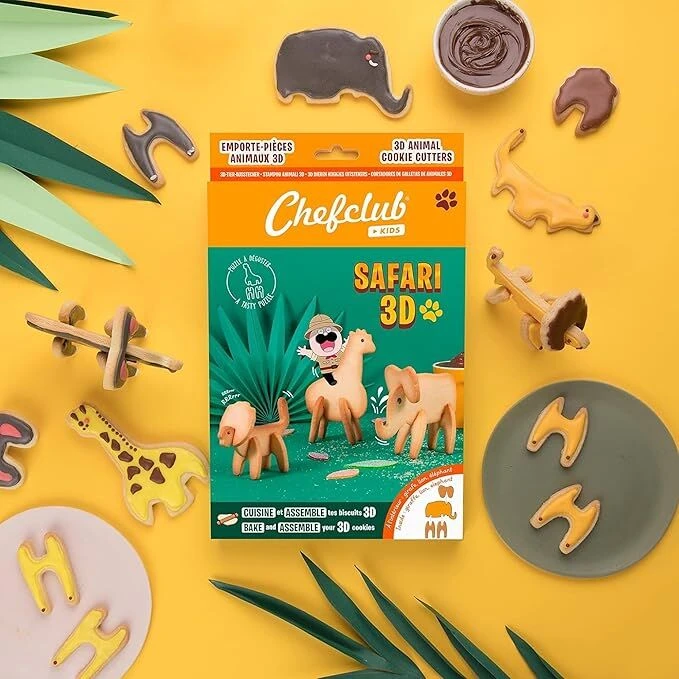 De 8-delige Chefclub uitsteekvormset met safari-thema is gemaakt van roestvrij staal. De set bevat 8 uitstekers in de vormen van verschillende lichaamsdelen van een olifant, leeuw en giraffe. Na het bakken kunnen de onderdelen in elkaar worden gezet, zodat de dieren een 3D-vorm krijgen.