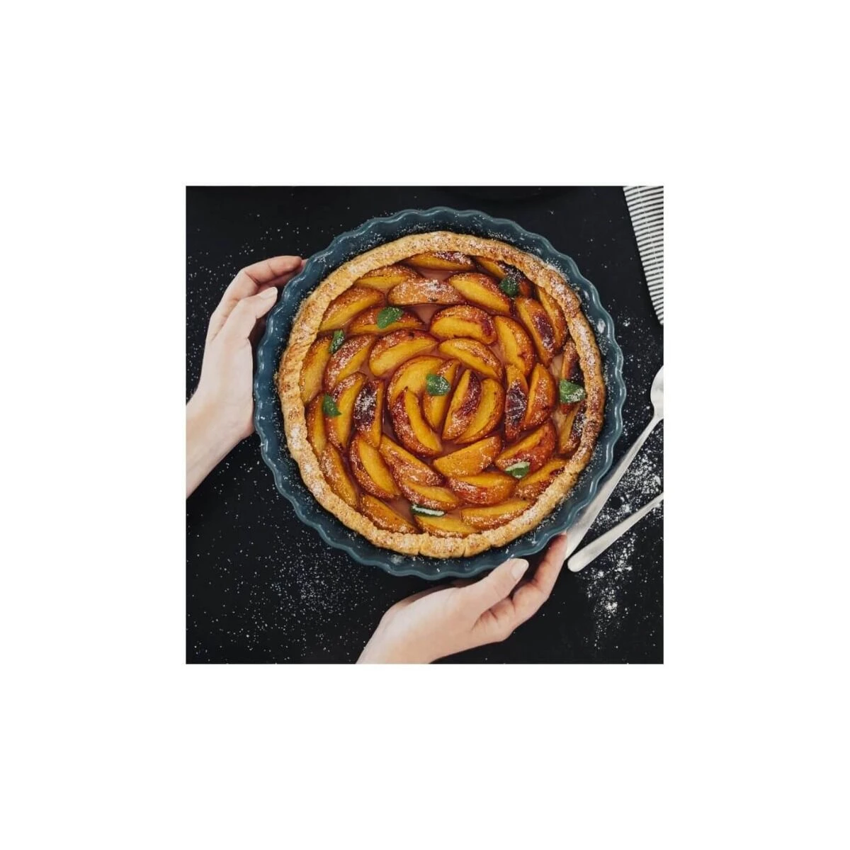 De Emile Henry diepe taartvorm is gemaakt van donkergroen geglazuurd aardewerk, heeft een diameter 24 cm en een hoogte van 5 cm. De rand van de vorm golft sierlijk voor een bijzondere rand aan uw gebak. In de vorm bereidt u taarten zoals clafoutis, pies of quiches.