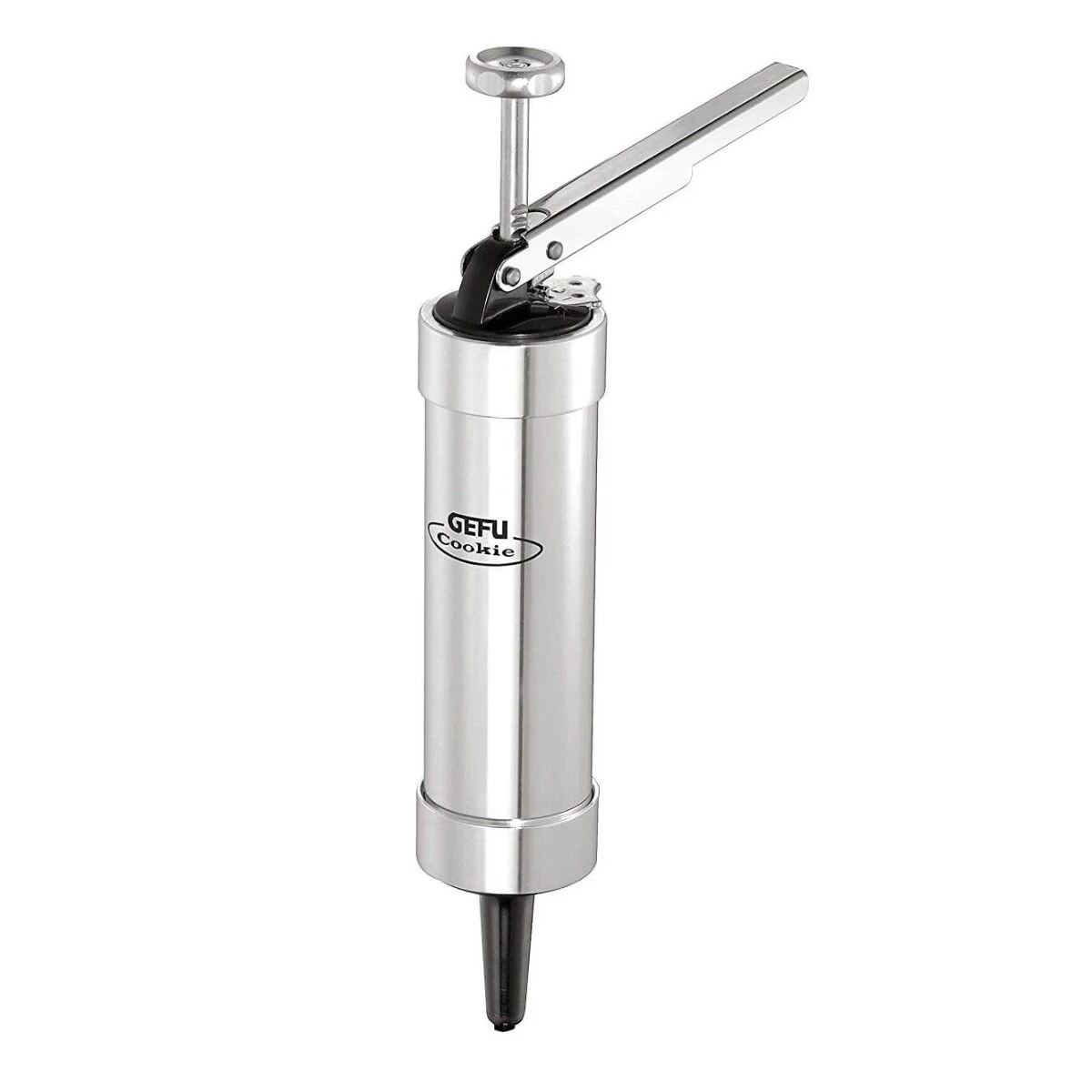 De Gefu koekjespers is vervaardigd uit aluminium en wordt geleverd met 4 spuitmonden en 20 mallen met verschillende motieven. Gebruik het koekjespistool om koekjesdeeg in verschillende vormen op een bakplaat te spuiten.