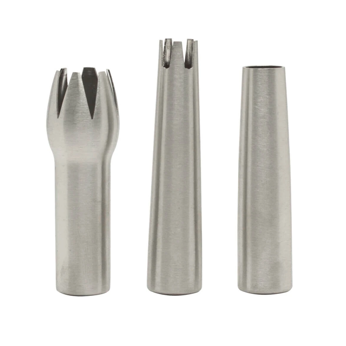Set van 3 volledig roestvrijstalen spuitmonden voor de iSi sifons. De set bevat een gladde spuitmond, een gekartelde spuitmond en tulpvormige spuitmond. Gebruik de verschillende spuitmonden om vorm te geven aan de bereidingen in uw sifon.