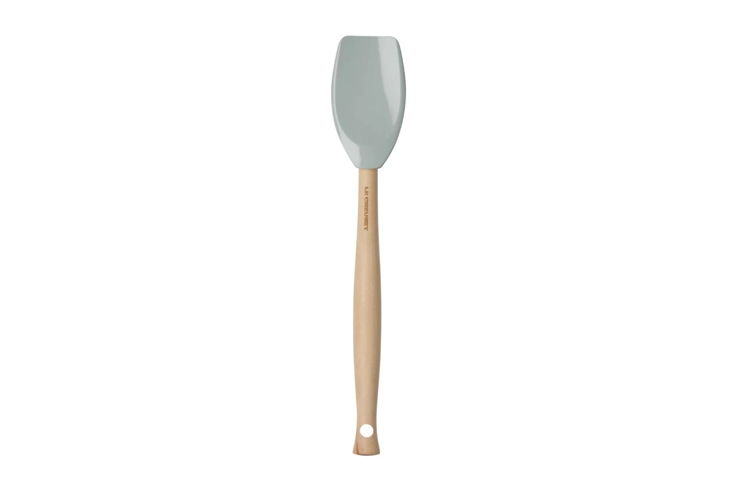 De Sea Salt, lichtblauw/groene Le Creuset grote spatel is gemaakt van hout en heeft een siliconen blad, waardoor de spatel niet krast. De spatel heeft een platte en bolle zijde en heeft een lengte van 28 cm. De breedte van het blad is 7 cm.