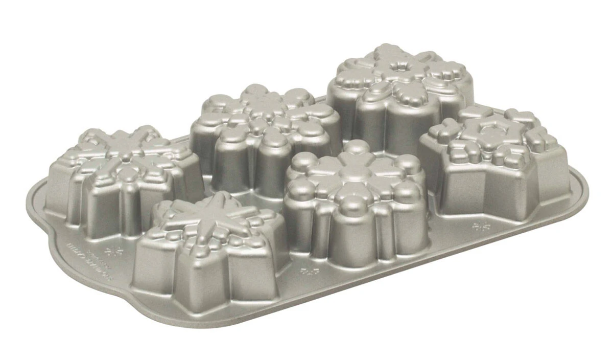 De bakvorm van Nordic Ware is gemaakt van aluminium en bevat 6 sneeuwvlokken. De warmte-reflecterende antikleeflaag van de bakvorm voorkomt aanbakken en zorgt voor een goede lossing van de inhoud. Voor 6 cakes of broden in de vorm een sneeuwvlok.
