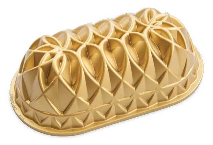 De Nordic Ware Jubilee Loaf Pan bakvorm is gemaakt van gietaluminium en heeft een inhoud van 1,42 liter. Aan de buitenzijde heeft de vorm een goudkleurige coating en is de vorm voorzien van een stijlvol motief, met veel holtes waar glazuur in kan blijven liggen. De vorm is voorzien van een antikleeflaag, voor een eenvoudige lossing van de inhoud. Voor het bakken van cake en brood.