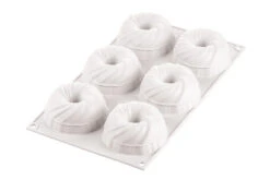 De Silikomart flexibele bakvorm heeft 6 vormen van tulbanden. Afzonderlijk hebben de vormen een diameter van 7,5 cm en een hoogte van 3,5 cm met een inhoud van 105 ml. De gehele vorm is 30 cm lang en 17 cm breed met een totale inhoud van 630 ml.