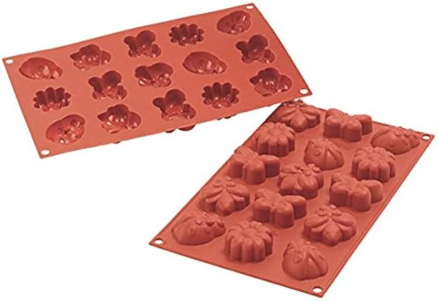 De flexibele Silikomart bakvorm bevat 15 vormpjes in de vorm van lieveheersbeestjes, vlinders, wespen en bloemen. De bakvorm en gemaakt van silicone. De taartjes hebben elk een afmeting van 5 x 3,88 x 2 cm. De bakvorm heeft een totale inhoud van 305 ml.