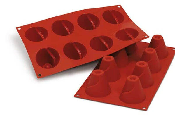 De flexibele bakvorm van Silikomart heeft 8 vulkaanvormen en is gemaakt van bruin silicone. Ieder vulkaantje heeft een diameter van 6 cm, is 5,1 cm hoog en heeft een inhoud van 72 ml. De gehele bakmat heeft een inhoud van 576 ml.