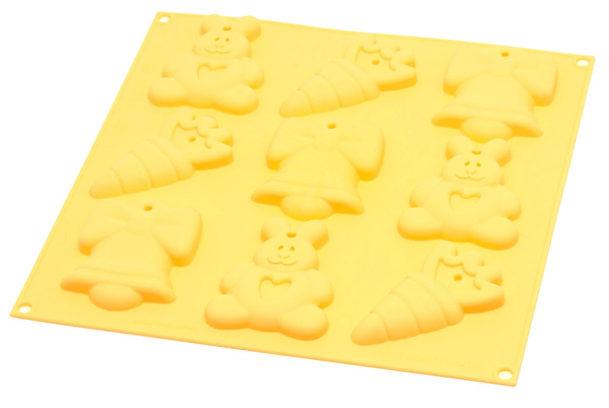 De flexibele Silikomart My Easter Cookies bakvorm heeft 9 vormen voor koekjes met een Pasen thema en is gemaakt van geel silicone. De bakmat is 30,5 cm lang en breed. De vormen zijn 1,4 cm hoog. De bakvorm bevat de volgende 3 verschillende vormen: