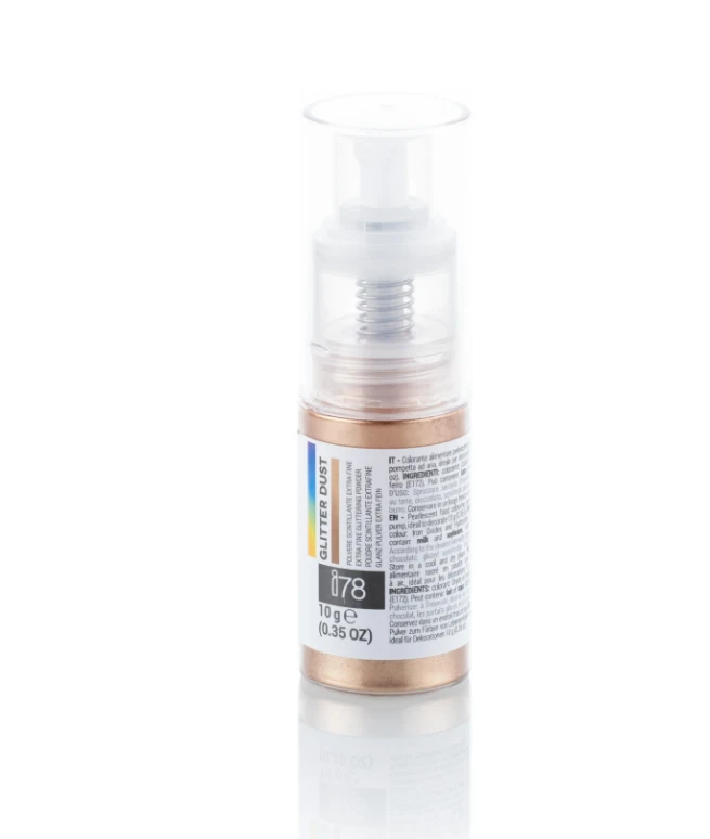 De bronskleurige Silikomart Glitter Dust komt in een spray met een inhoud van 10 gram en is ideaal om uw taarten, cakes en bijvoorbeeld chocolade mee te decoreren. Spray licht voor een subtiele glitter of spray lang op dezelfde plaats voor een echt glittereffect.
