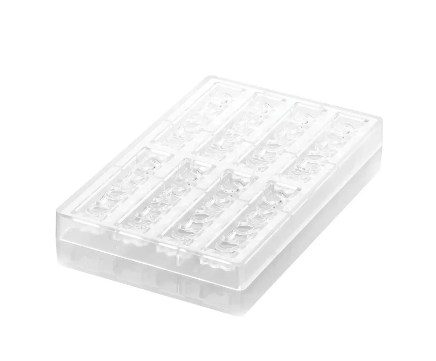 De Silikomart Goccia-B bakvorm bevat verschillende organische vormen in de lengte van een chocoladereep. De transparante siliconen bakvorm is geschikt voor gebruik in de diepvries.