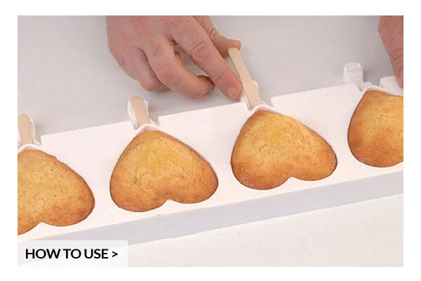 De Silikomart flexibele bakvorm komt in een set van 2, elke vorm bevat 4 harten. Afzonderlijk hebben de harten een lengte van 9,1 cm, een breedte van 8,5 en een hoogte van 2,3 cm met een inhoud van 96 ml. De gehele vorm is 30 cm lang en 17 cm breed met een totale inhoud van 384 ml. De set wordt geleverd met 50 ijsstokjes en een tray van kunststof, deze kan niet in de oven.