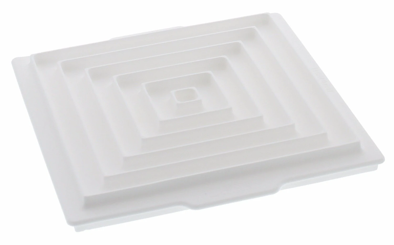 De vierkante Silikomart Professional Insert Decor is gemaakt van wit silicone en heeft aan elke zijde zes vierkante ringen in oplopende maten. Elk van de ringen is 2 cm breed en één cm hoog. De ringen lopen in lengte en breedte op van 2 x 2 cm tot 24 x 24 cm, in stappen van 2 cm.