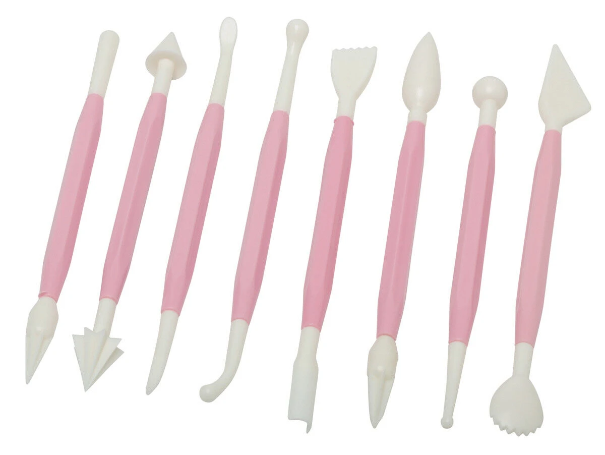 De 8 Silikomart Wondercake roze kunststof decoratiegereedschappen zijn ieder 16 cm lang en 2-2,5 cm breed. De gereedschappen hebben een roze zeskantige greep voor een goede grip en zijn aan 2 kanten te gebruiken. Gebruik de set voor het vormen van poppetjes, bloemen en andere vormen uit marsepein en fondant.